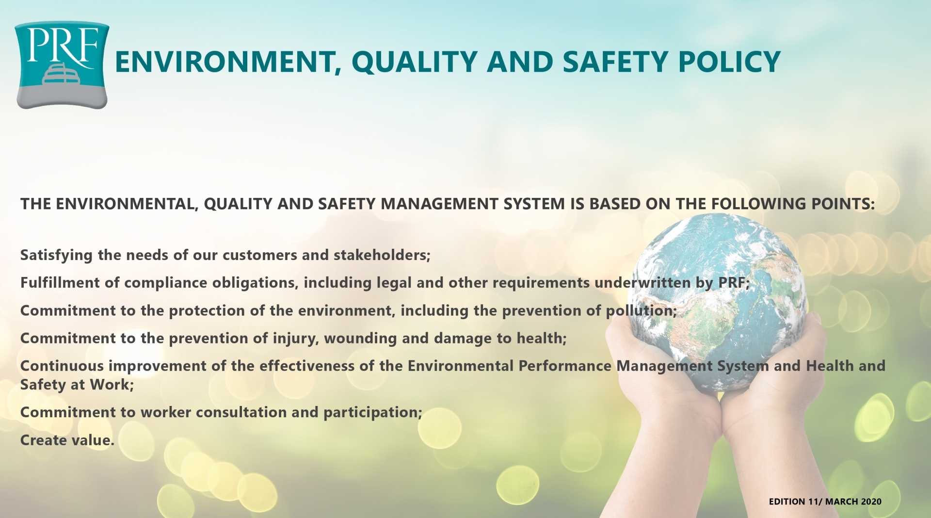The Integrated Management System (Environment, Quality, Occupational Health and Safety, and Information Security) is based on the following principles: